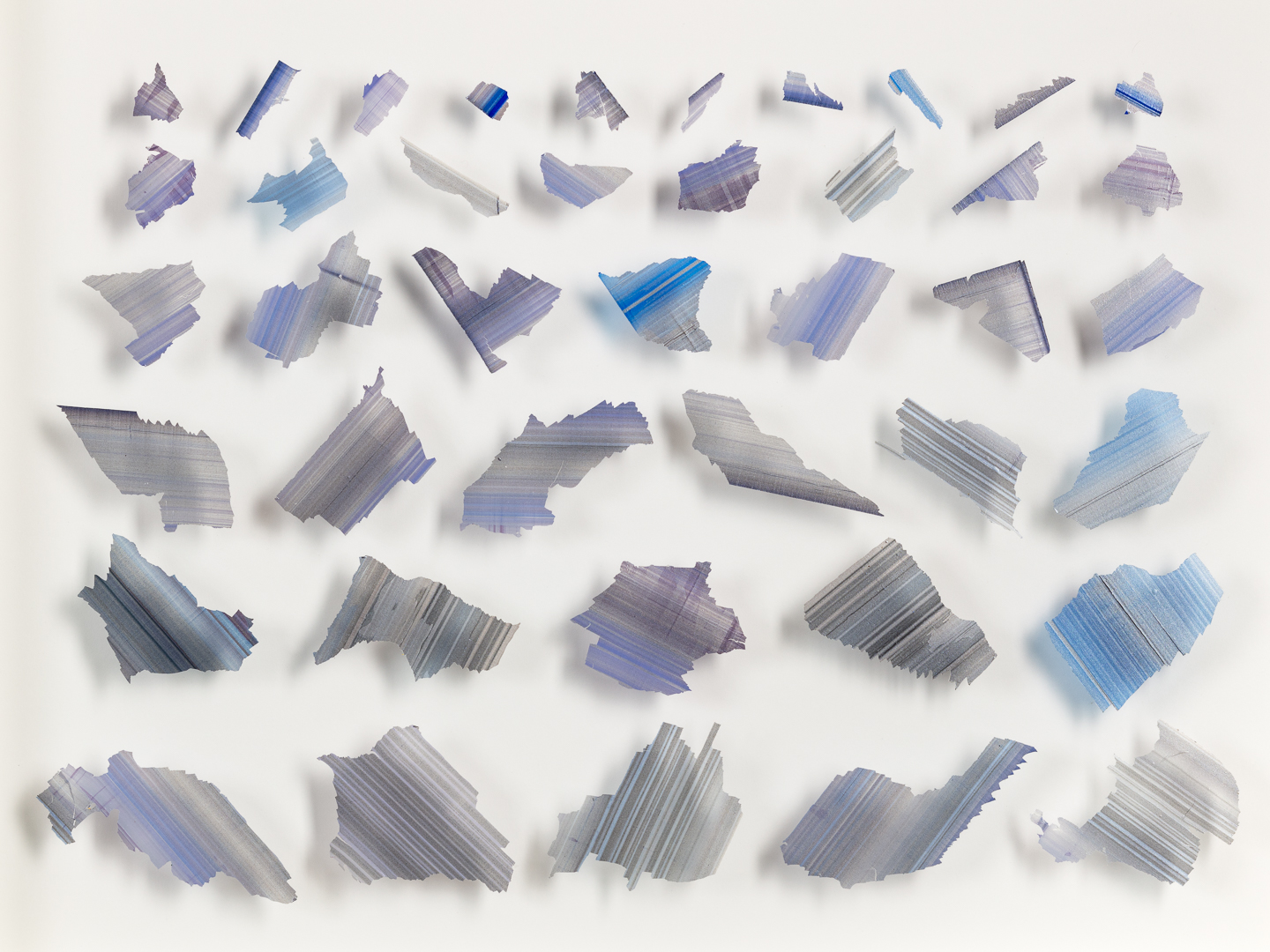 Butcher is philosophically incapable of an act of destruction. It is not mindless destruction; it is repositioning. Like a conservationist unpicking or separating one material from another - the paint layer from the support - it is a slow deliberate action followed by reordering and rebuilding. Situated in glass at a distance from the backing board the fragments are accompanied by mesmeric shadows which play on the idea of shadows of a former self."